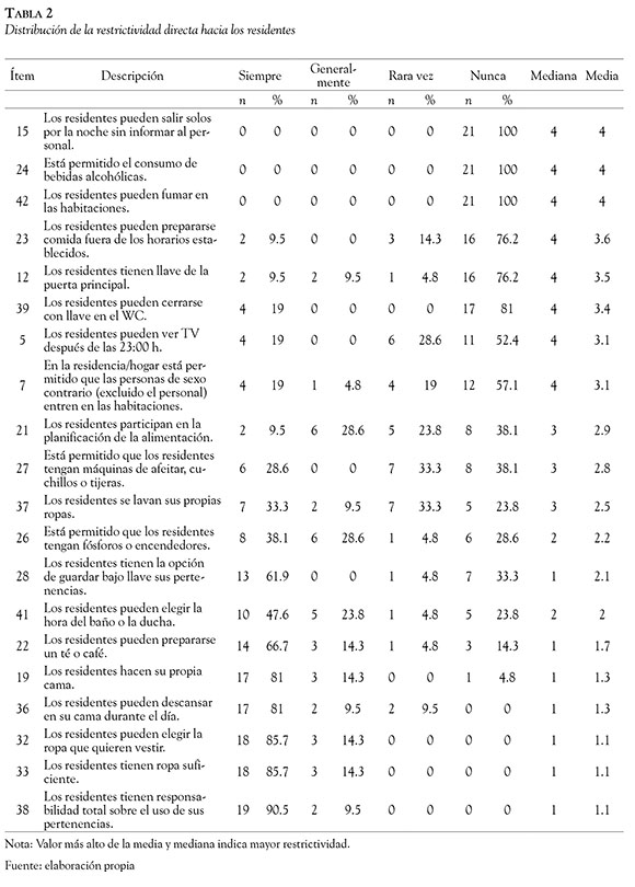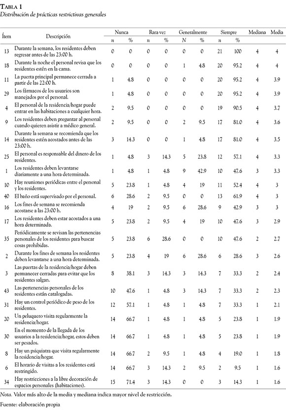 Usando la prueba de Friedman, se observaron diferencias estadísticamente significativas en el nivel de restrictividad general, X2(22) = 175.49, p < 0.001. Como se puede ver en la Tabla 1, las mayores restricciones de los dispositivos están en los horarios, tanto de llegada al lugar como de ir acostarse durante los días de semana. En relación con este último punto, se vigila que los residentes estén en sus camas durante la noche. También el personal puede ingresar a las habitaciones en cualquier momento, maneja los fármacos de los usuarios y en un 80 % de los dispositivos entre, siempre y generalmente, el dinero de los residentes es administrado por los cuidadores. En términos de las actividades donde existen menores restricciones, se encuentra el permitir visitas a los residentes, la ausencia de visitas por parte de psiquiatra al dispositivo, el no control del peso de los residentes y la libertad para decorar las habitaciones.