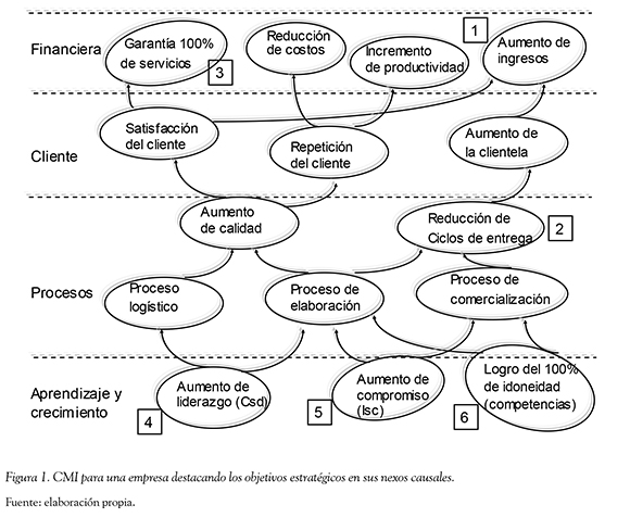 Al iniciar este artículo, se señaló que la medición del sentido de compromiso se requería para considerarla en la planificación de la GH y en su control de gestión estratégica. Para ilustrar esta afirmación, se presenta el Cuadro de Mando Integral ([CMI], Figura 1) que corresponde al concebido por Robert Kaplan y David Norton (Kaplan & Norton, 2004), en el cual se consideraron intangibles como el referido al Índice de sentido de compromiso (Isc), previamente tomado en cuenta para la planificación en busca de su incremento (Norton, 2001). Aparecen ahí enumerados los indicadores intangibles (4, 5 y 6), evidenciándose los nexos causales o hipótesis entre los diferentes objetivos estratégicos planteados. Igualmente, se muestra un fragmento de la tabla donde se desglosan los objetivos planificados con sus indicadores (Tabla 8).