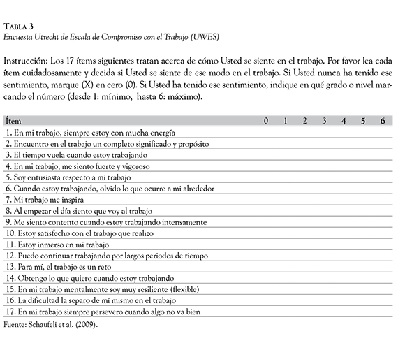 Ese instrumento, denominado Encuesta Utrecht de Escala de Compromiso con el Trabajo (UWES, por sus siglas en inglés), consta de 17 ítems y contempla tres componentes básicos que caracterizan, según los autores, el sentido de compromiso con el trabajo: vigor, dedicación y absorción. En la encuesta, seis ítems se refieren al vigor, que significa altos niveles de energía y resiliencia, completa ausencia de fatiga y persistencia ante los hechos y desafíos, representado por la frase: "en mi trabajo, yo siempre me siento con energía". El segundo componente es la dedicación, con cinco ítems, se presenta cuando el trabajador otorga un sentido de importancia tal a su trabajo que lo impulsa a producir mejor, mostrando un sentimiento de inspiración y desafío, tal como se presenta en la siguiente afirmación: "yo encuentro en el trabajo un completo significado y propósito". Y el tercer componente es la absorción, con 6 ítems, se caracteriza por que el trabajador se encuentra totalmente inmerso y contento en su trabajo, superando dificultades y pasándole rápido el tiempo, siendo la frase que lo refleja: "cuando estoy trabajando, olvido cualquier otra cosa alrededor mío". La encuesta UWES también tiene siete rangos en su escala, pero en esta, respecto a la anterior, sí se manifiesta una linealidad o continuidad en su valoración (a diferencia de la encuesta de POA, se insiste), que va de 0 a 6, indicando el valor 6 el máximo de sentido de compromiso.