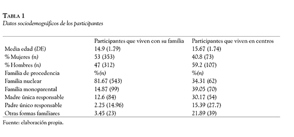 Un total de 180 de estos adolescentes y jóvenes vivían en una de las 17 instituciones participantes. Estas instituciones son centros donde residen los menores bajo el sistema de protección de la región autonómica donde se recogieron los datos. El resto de la muestra, 665 chicos y chicas, sí vivían con sus familias y acudían a uno de los 7 institutos en los que se recogieron los datos. La Tabla 1 presenta los datos sociodemográficos de ambas muestras.