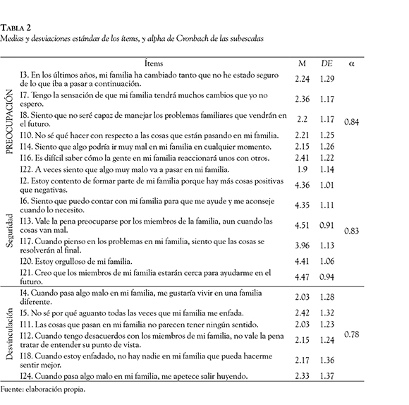 En la versión inglesa, se extrajeron tres factores: preocupación (p. ej., "tengo la sensación de que mi familia tendrá muchos cambios que yo no espero"), seguridad (p. ej., "creo que los miembros de mi familia estarán cerca para ayudarme en el futuro") y desvinculación (p. ej., "cuando pasa algo malo en mi familia, me gustaría vivir en una familia diferente"). Para aceptar esta solución de tres factores, se eliminaron dos ítems.