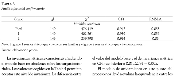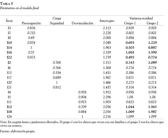 Dado que se pretendía evaluar la equivalencia de un modelo de medida en la muestra de adolescentes que viven con su familia y la muestra de los que residen en centros, se analizó progresivamente la invarianza factorial. El CFA permitió validar el modelo analizado satisfactoriamente en los dos grupos y en la totalidad de la muestra. Se alcanzó el nivel de equivalencia escalar entre los chicos que viven en centros y los que viven con sus familias. El modelo de invarianza estricta parcial solo pudo ser aceptado tras estimar libremente las varianzas residuales de siete de los 19 ítems que componen SIFS. En la escala Preocupación se liberaron las restricciones sobre los ítems 10, 14, 16 y 22; en la escala Seguridad sobre el ítem 2 y en Desvinculación sobre los ítems 12 y 18.