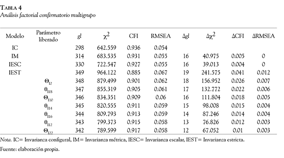 La evaluación progresiva de la invarianza comenzó por el modelo de invarianza configural. Los índices de ajuste obtenidos permitieron aceptar la equivalencia de los modelos de medida básicos entre los dos grupos tratando las variables como continuas. Los índices de bondad de ajuste fueron CFI = 0.936 y la raíz media cuadrática no fue superior a 0.08, RMSEA = 0.054.