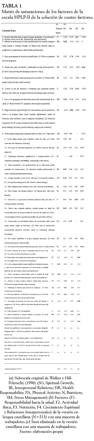 The Health Promoting Lifestyle Profile II (HPLP-II) de Walker y Hill-Polerecky (1996) evalúa los comportamientos promotores de salud que sirven para mantener o aumentar el bienestar y la satisfacción de la persona. La adaptación al español de la escala HPLP-II realizada por Hulme et al. (2003) fue llevada a cabo con estudiantes, en el presente estudio se desarrolla con población trabajadora, para lo cual se formulan los siguientes objetivos: primero, la consistencia interna evaluada a partir del AFE distinguirá los seis factores de la escala original inglesa (Actividad física, Crecimiento espiritual, Manejo del estrés, Nutrición, Relaciones interpersonales y Responsabilidad hacia la salud); segundo, los factores de la escala tendrán una fiabilidad adecuada y tercero, los factores de la escala mostrarán indicios de validez con correlatos externos.