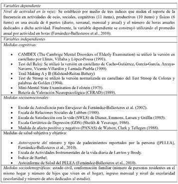 En la Tabla 1, se presentan los instrumentos de medición utilizados (para mayor información, véanse, Fernández-Ballesteros et al., 2004; Blanco-Molina & Salazar-Villanea, 2014a, 2014b, 2014c).