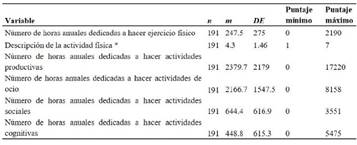 En primer lugar, se describen los datos de la variable dependiente (criterio de envejecimiento con éxito) del modelo, definida como el número de horas anuales dedicadas a la realización de actividades sociales, de ocio, cognitivas, productivas-instrumentales y físicas (Tabla 2).