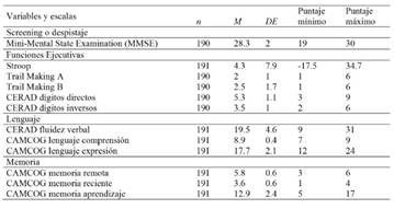 Tabla 4 Descriptivos de las característica cognitivas en la muestra estudiada