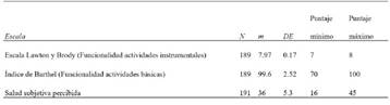 A pesar de estas condiciones, la mayoría de la muestra (considerando las medidas de funcionalidad en actividades de la vida cotidiana e instrumental) está constituida por personas funcionalmente independientes. Es interesante evidenciar que, aunque presentan algún tipo de patología, refieren que su salud es muy buena y que están mejor que otros de su misma edad y sexo, como lo evidencia la medida de salud subjetiva (Tabla 5).