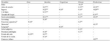 Finalmente, las actividades productivas/ instrumentales correlacionaron negativamente con el nivel educativo, ingreso reportado, medida factorial resultante de variables socioemocionales, variable global de memoria (15.6 % varianza explicada, 1.2 valor característico) y con el consumo de tabaco. Presentaron, sin embargo, correlaciones positivas con el tamaño del hogar.