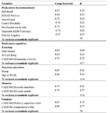 Se realizó un análisis de componentes principales con rotación VARIMAX para maximizar la varianza de las medidas (Martínez, Hernández, & Hernández, 2006), y así poder agrupar las variables socioemocionales y cognitivas que han sido identificadas como predictoras del envejecimiento con éxito en la literatura clásica y en la más actual (Baltes & Baltes, 1990; Fernández-Ballesteros et al., 2002; Freund et al., 2009; Jopp & Smith, 2006; Parslow et al., 2011).