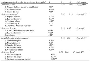 Sin embargo, en la muestra estudiada se evidencian diferencias importantes entre los factores que predicen los distintos tipos de actividad, aspecto relevante para el desarrollo de programas que promuevan estilos de vida saludables durante la vejez.