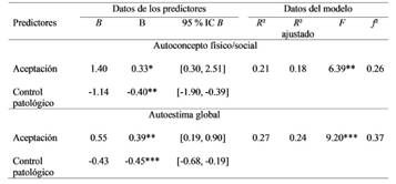 En la Tabla 3, se presentan los resultados de los modelos de la percepción de la relación con el padre, que predijeron significativamente las autopercepciones de las niñas. En el dominio físico/social, una elevada aceptación y un bajo control patológico fueron predictores de una autopercepción más positiva. El porcentaje de varianza explicada por el modelo fue del 18 %. El tamaño de efecto fue mediano. Estas mismas variables predijeron la autoestima global de las niñas. El porcentaje de varianza explicada por el modelo fue del 24 %. El tamaño del efecto fue alto.
