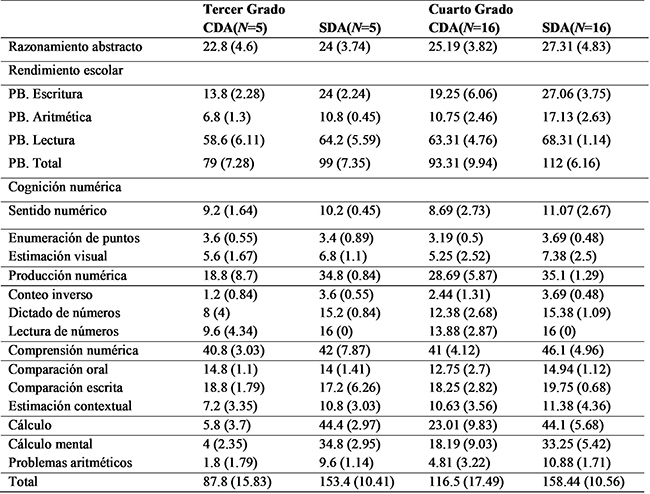 La Tabla 2 presenta los resultados [media (desviación estándar)] obtenido por los niños CDA y SDA de 3.º y 4.º grado, en la evaluación de la batería neuropsicológica de procesamiento numérico y cálculo Zareki-R. Los niños CDA alcanzaron puntuaciones más bajas en comparación con los niños SDA en todos los subtest de la batería.