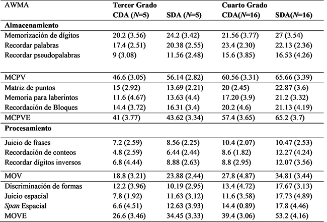 TABLA 3 Puntuaciones [Media (Desviación Estándar)] obtenidas por los grupos CDA y SDA en el Test AWMA
