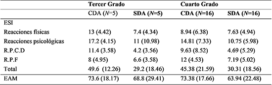 Leyenda: CDA: con dificultades aritméticas, SDA: sin dificultades aritméticas. ESI: Escala de Stress Infantil. R.P.C.D: Reacciones psicológicas con componentes depresivos. RPF: Reacciones Psicofisiológicas. EAM: Escala de Ansiedad a las Matemáticas.
