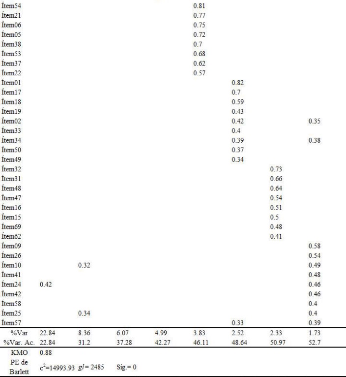 En la Tabla 1 se muestra la estructura factorial resultante de la escala, suprimiendo las cargas factoriales más reducidas (< 0.3). La solución factorial quedó constituida por ocho factores que explicaron un 52.7 % de la varianza.