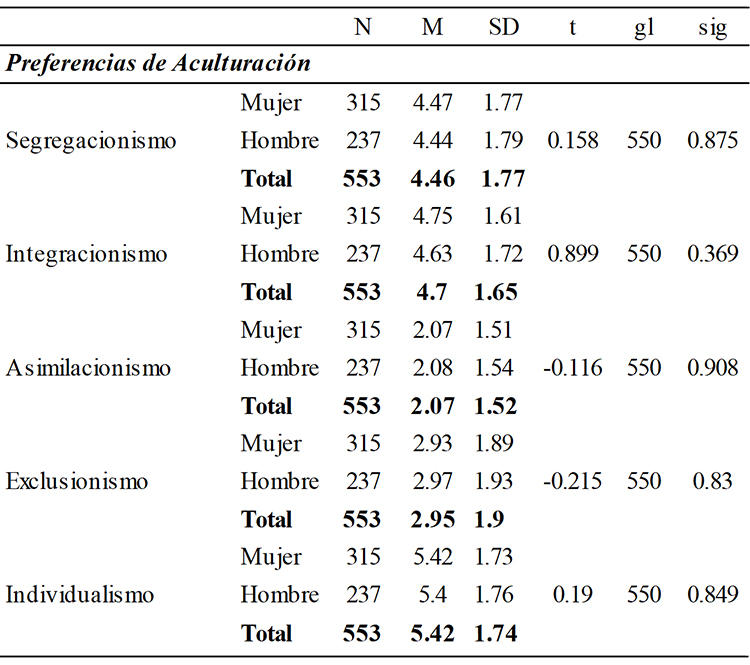TABLA 1 Descriptivos y diferencia de medias por sexo para Preferencias de aculturación