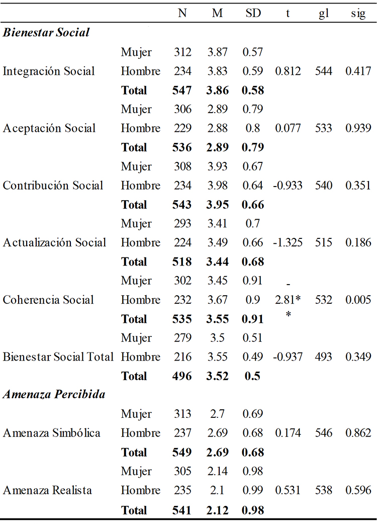 No se encontraron diferencias estadísticamente significativas entre hombres y mujeres en los puntajes de las preferencias de aculturación, ni en amenaza percibida. En bienestar social no existieron diferencias significativas entre los sexos, salvo en la dimensión de coherencia social (Mujer M = 3.45, SD= 0.91; Hombre M= 3.67, SD= 0.9; t(532) = -2.81, p = 0.005). Por lo anterior, en adelante se tomará como solo un grupo sin hacer diferencias por sexo.