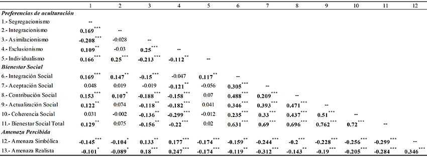 El segregacionismo se relaciona de forma contraria a lo esperado, y se correlaciona de forma positiva con el bienestar social (r = 0.13, p < 0.01), y de forma negativa con la amenaza percibida (Simbólica r = -0.15, p < 0.001; Realista r= -0.1, p < 0.05). El integracionismo se vincula de forma positiva solamente con las dimensiones de integración (r = 0.15, p < 0.01) y contribución social (r = 0.11, p < 0.05), y de forma negativa con la amenaza realista (r = -0.09, p < 0.05) y simbólica (r=-0.10; p < 0.05). Y finalmente, el individualismo se relaciona de forma positiva con la integración social (r = 0.12, p. < 0.01) y de forma negativa con ambos tipos de amenaza percibida (Simbólica r = -0.17, p < 0.001; Realista r= -0.17, p < 0.001).