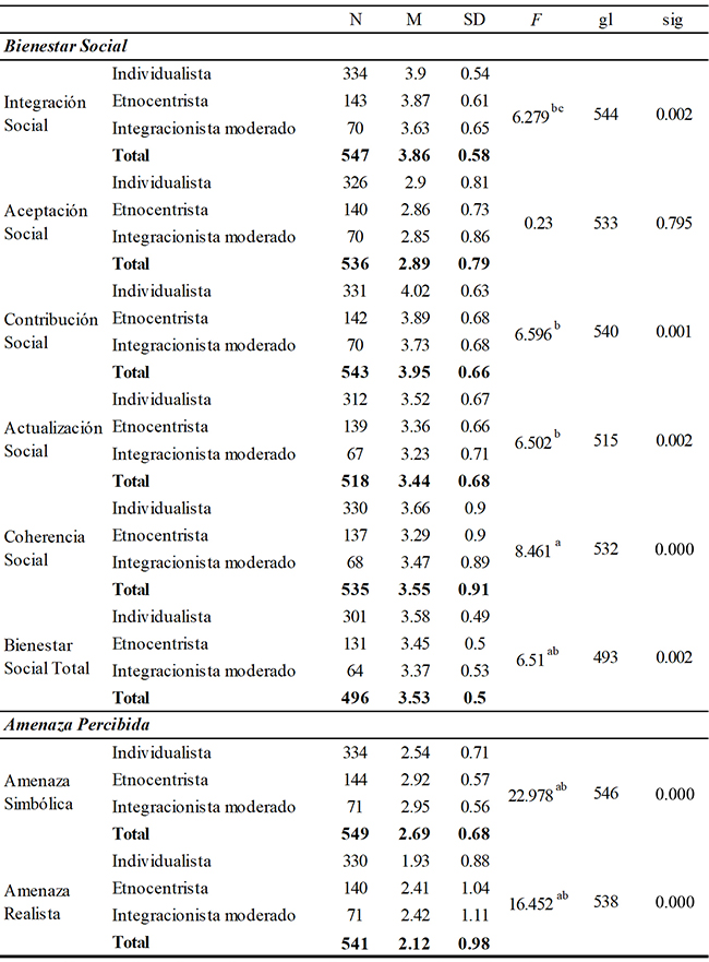 A continuación, se realizó un análisis de media (ANOVA) para identificar diferencias entre los grupos en los puntajes obtenidos tanto en amenaza percibida, tanto simbólica como realista, así como en bienestar social y sus distintas dimensiones.