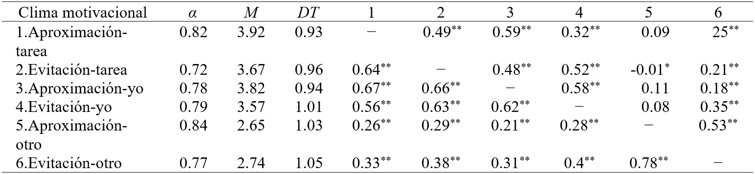Los resultados del análisis apoyaron con firmeza el modelo hipotético S-Bχ2 (120, N = 192) = 134.42, p > 0.05; S-Bχ2/df = 1.43; *CFI = 0.99; *RMSEA (90 % CI) = 0.025 (0-0.045); SRMR = 0.04; Potencia = 1. Cada una de las estructuras del clima motivacional mostró un alto nivel de fiabilidad. La Tabla 1 presenta los estadísticos descriptivos y las consistencias internas de los diferentes tipos de clima motivacional percibido.