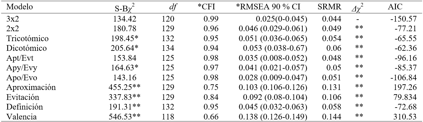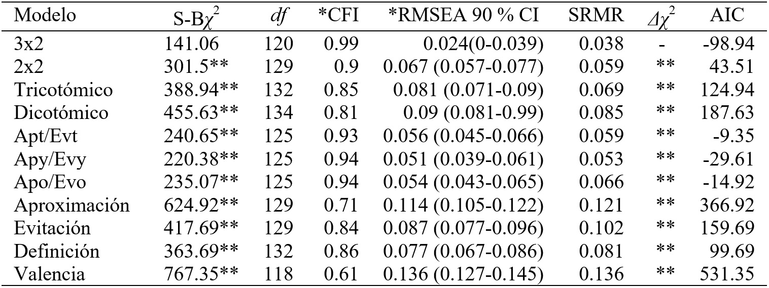 Se siguió el procedimiento descrito en el Estudio 1 para comparar el ajuste del modelo hipotético con 10 modelos alternativos. Se utilizaron el test de la diferencia de S-Bχ2 y el indicador AIC para evaluar el ajuste relativo del modelo 3x2 con los modelos alternativos. Las comparaciones indicaron que el modelo hipotético proporcionaba un mejor ajuste a los datos que cualquier modelo alternativo (Tabla 4).