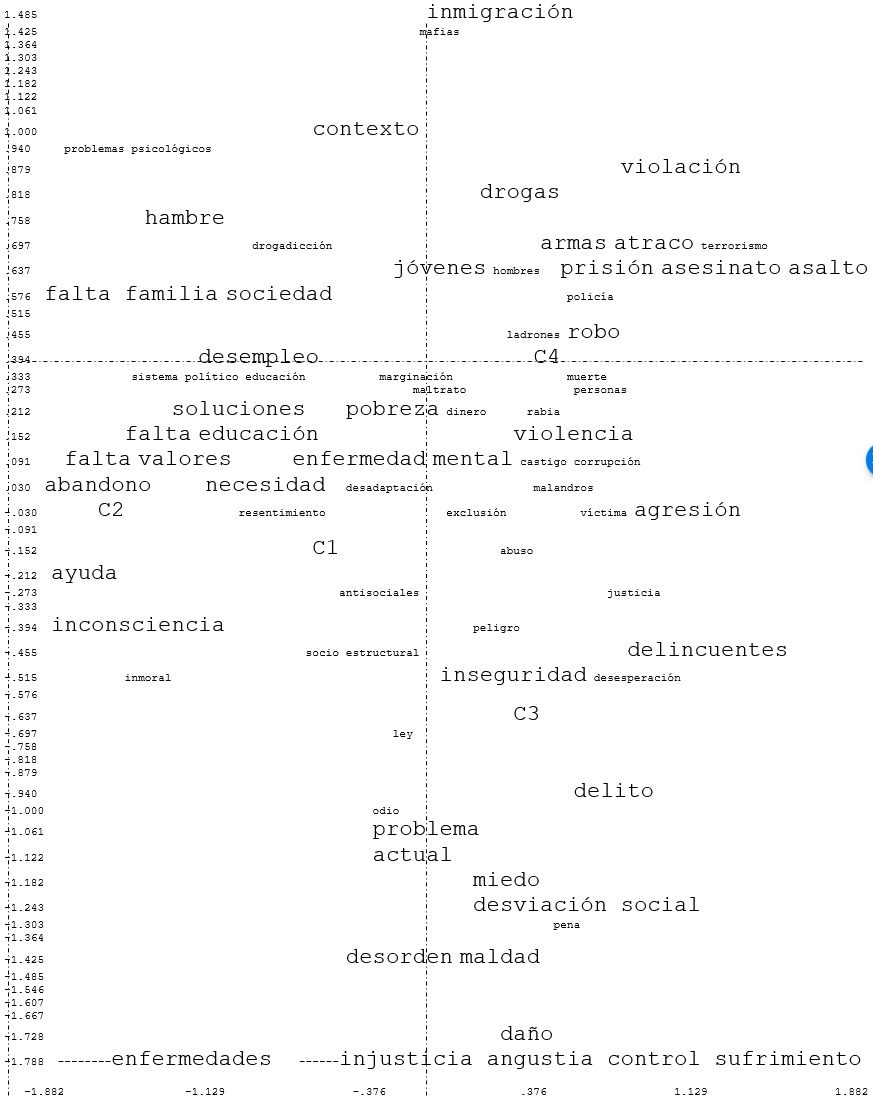 Con el fin de indagar en la articulación de los sistemas de creencias, se realizó un AFC utilizando como modalidades activas las palabras asociadas al estímulo “delincuencia”. Estas dan cuenta de la objetivación: la forma como un fenómeno más o menos complejo se transforma en metáforas, imágenes y conceptos concretos. El análisis produjo 15 factores cuyo valor propio medio (S vp = 100/15) fue de 4.5, por encima de dicho valor se encontraban los cinco primeros factores, los cuales presentaban una traza de la inercia acumulada del 12.3 %. La extracción final de dichos factores se realizó sobre aquellas dimensiones con valor propio superior a 0.54 (4.39 % de la inercia), correspondiendo a un total de dos que mostraron una traza de la inercia acumulada del 5.39 % (2.83 % y 2.56 %, respectivamente), adecuada en este tipo de AFC. Un número mayor habría hecho extremadamente dificultosa la interpretación. Posteriormente, el análisis produjo la tabla de coordenadas, contribuciones y cosenos cuadrados. Para la interpretación de los ejes factoriales, se necesitan tanto las coordenadas como las contribuciones de cada modalidad a la composición del factor y las contribuciones relativas o cosenos cuadrados que constituyen el porcentaje explicado por el factor. Esto puede evitar interpretaciones erróneas basadas simplemente en los gráficos de las proyecciones de las modalidades en los ejes factoriales. Así, el criterio utilizado para especificar las mayores contribuciones, es que fuera superior a la media (en nuestro caso 100/75 modalidades = 1.33).