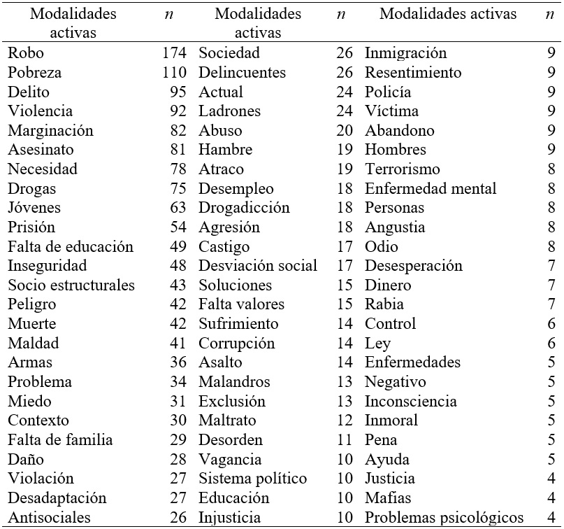 El análisis de contenido de las palabras que el alumnado universitario asoció al concepto de “delincuencia” se realizó tomando aquellas que tuvieron una frecuencia superior a tres. El diccionario de palabras fue creado a partir del total de las asociaciones al estímulo delincuencia. La producción total de palabras se redujo a dimensiones con el mismo significado. Así, de un total de 2 082 palabras, se extrajeron 75 categorías que equivalen a un 96.69 % del total de los conceptos emitidos.