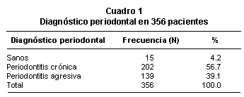 De los 356 informes microbiológicos analizados, 204 (57.3%) correspondieron a mujeres y 152 (42.7%) a hombres. La distribución de la muestra según el diagnóstico periodontal se presenta en el Cuadro 1, donde se aprecia un mayor número de pacientes con enfermedad periodontal crónica, seguidos de enfermedad periodontal agresiva e individuos sanos.