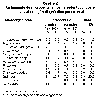Materiales y métodos: Se estudiaron los informes microbiológicos de 356 pacientes en un período de 41 meses. Las variables analizadas fueron: diagnóstico periodontal, recuento total de colonias, porcentaje de aislamiento de diez microorganismos periodontopáticos y de otros inusuales como miembros de la familia Enterobacteriaceae, bacilos Gram negativos no fermentadores y levaduras.