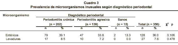 Resultados: Se analizaron 202 (56.7%) informes de pacientes con periodontitis crónica, 139 (39.1%) de periodontitis agresiva y 15 (4.2%) de individuos periodontalmente sanos. La presencia de microorganismos inusuales de tipo entérico fue 36% y la prevalencia de levaduras 7% en las personas con periodontitis. No se encontraron diferencias significantes entre los tres diagnósticos clínicos con respecto a la presencia de microorganismos entéricos y levaduras. La mayor prevalencia de organismos entéricos correspondió a los géneros Klebsiella, Enterobacter y a bacilos Gram negativos no fermentadores. Se encontraron asociaciones estadísticamente significativas entre la presencia o ausencia de microorganismos infrecuentes con la de algunos microorganismos periodontopáticos en los individuos con enfermedad periodontal.