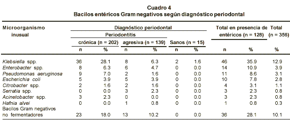 Las prevalencias de los microorganismos inusuales presentes según el diagnóstico periodontal aparecen en el Cuadro 3. En éstas no hubo diferencias significativas para la frecuencia entre los grupos. Como la mayor prevalencia de microorganismos inusuales corresponde a enterobacterias, la distribución de bacilos Gram negativos entéricos se presenta en el Cuadro 4. Organismos pertenecientes a los géneros Klebsiella, Enterobacter y las especies P. aeruginosa y Escherichia coli se mostraron como los más frecuentes entre los pacientes con enfermedad periodontal, mientras que en los sanos hubo dos aislamientos de especies del género Klebsiella. También se encontraron bacilos gramnegativos no fermentadores en una alta proporción en personas con enfermedad periodontal crónica o agresiva, no así en individuos sanos.