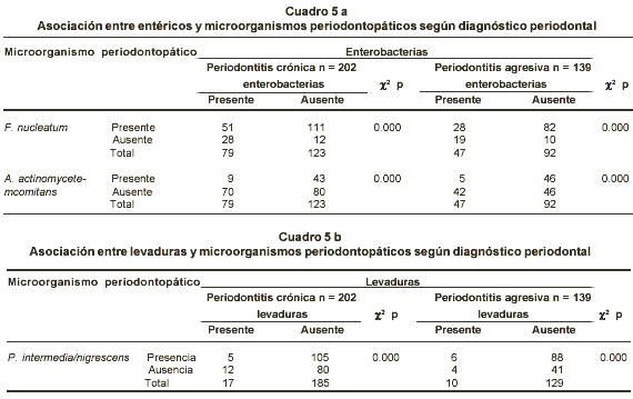 En el Cuadro 5 se presentan las asociaciones entre microorganismos inusuales con algunas bacterias periodontopáticas, en los grupos de pacientes con periodontitis. En ambos, se encontró una relación estadísticamente significativa entre la presencia de enterobacterias y la ausencia de A. actinomycetemcomitans, mientras que en ausencia de entéricos hubo mayor presencia de especies de Fusobacterium. También se encontró en estos grupos una asociación estadísticamente significativa entre la ausencia de levaduras y la presencia de P. intermedia/nigrescens.