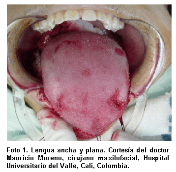 Características clínicas. Se observa un agrandamiento de la lengua que adquiere aspecto festoneado y una forma ancha y plana; mordida abierta (anterior o posterior); como la lengua llena la cavidad oral, a través de la mordida abierta anterior, ella se ubica entre los dientes en reposo. Puede haber prognatismo mandibular, maloclusión clase III con o sin mordida cruzada, inclinación vestibular de los dientes posteriores (curva de Monson positiva en el arco superior, curva de Wilson invertida en el arco inferior), curva de Spee acentuada en el arco superior e invertida en el inferior, aumento de la dimensión transversal de los arcos y asimetría, diastemas en los arcos superior o inferior, glositis debido a respiración oral excesiva3,8,23-25,29,32,33 (Foto 1).