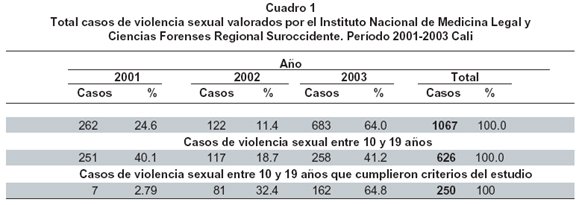 Objectives: To describe the occurrence of sexual violence cases denounced in teenagers from 10 to 19 years, during the 2001-2003 in Cali.
