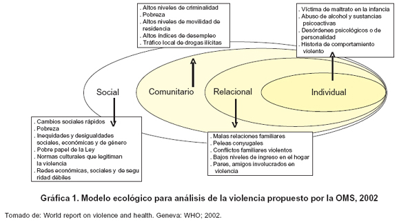 Se realizó un estudio de prevalencia de casos de los presuntos delitos sexuales valorados por clínica forense y trabajo social (INML y CF), ocurridos en el área urbana de Cali, en población de 10 a 19 años. El marco de trabajo que orientó el estudio es el modelo ecológico, usado por la Organización Mundial de la Salud para el abordaje de la violencia (Gráfica 1)11.