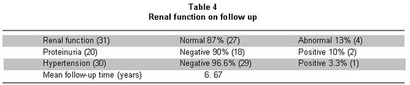 Twenty patients had information concerning proteinuria; it was negative by urinalysis, sulfosalicylic acid, or 24-hour urine collection sample in 18 (90%) of them. Only two patients had proteinuria, and were the ones with a 16-year follow up, above the 6.7-year average (Table 4).