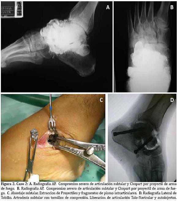 Posterior a la terapia quelante, el paciente fue llevado a cirugía para extracción de los proyectiles y reconstrucción del medio pié. (Figuras 1B-C).