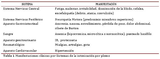 Las manifestaciones clínicas se correlacionan directamente con los niveles de plomo en sangre. La encefalopatía plúmbica ocurre con niveles mayores a 80 µg/dL, el deterioro cognitivo con 50 µg/ dL, la nefropatía con 40 µg/dL y la neuropatía periférica con 20 µg/dL.Algunas condiciones que producen estrés metabólico tales como: infección, endocrinopatía y alcoholismo, pueden ser un factor precipitante del cuadro 8,9,10.