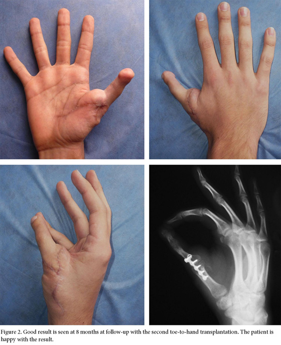 Discussion: In the more proximal finger amputations, a second toe is the most appropriate, with lower morbidity of the donor site. The rates of success are between 95 to 100%. We had a success rate of 100%. The resulting defect is in the foot is minimum when the second toe was used. The decision to use one of these techniques depends on the decision and transplant surgeon training. We always used the second toe for transfers to the hand, considering that it will be thinner than the original thumb; our patients had no complaint about the appearance.
