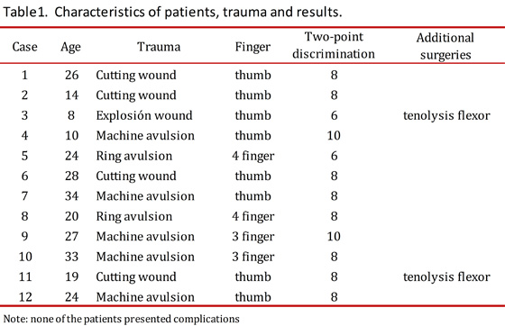 Results: We practiced 12 transplants, 8 thumb, and 4 in other fingers. Ten were adults and two children. All transplants survived. Two patients required tenolysis flexor. The sensibility was recovered with good 2-point discrimination of 8 mm.