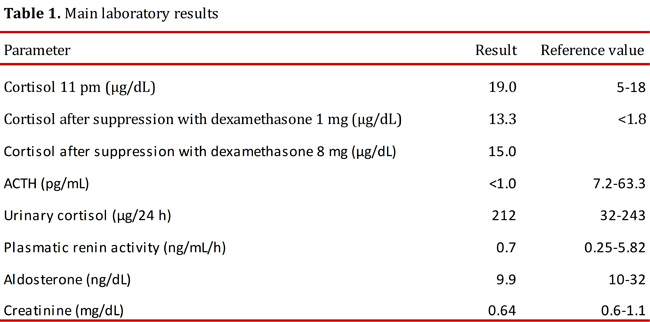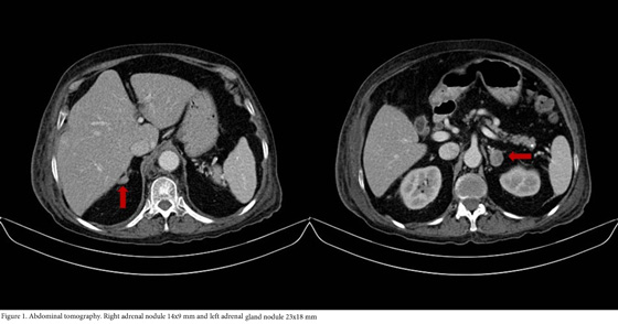 A 76 years-old woman with history of controlled hypertension (with losartan and amlodipine) presented to our hospital referring weight loss of 4 kg in two months, edema that progressed to anasarca and back lumbar pain. Besides the edema her physical examination was completely normal with no clinical signs suggestive of hypercortisolism. Among the studies requested, an abdominal tomography showed a right adrenal gland nodule of 14x9 mm and another one in the left adrenal gland of 23x18 mm (Fig. 1), additionally multiple vertebral fractures were reported. As part of the study of adrenal adenomas the patient had an abnormal value of cortisol after a low dose suppression test with dexamethasone (13.3 µg/dL (normal value: <1.8 µg/dL), with a normal value of free urinary cortisol and her potassium was low (she was not on diuretics). The results of the patient laboratory test are shown on Table 1.