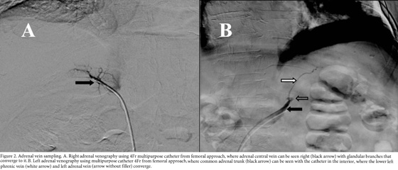 We made some changes to the procedure reported in the literature, given the difficulty with the measurement of catecholamines we chose to perform verification of proper positioning of the catheter tip by the image from the venography and to correct the dilution difference by measuring aldosterone, the biochemical diagnosis was confirmed histological which allows us to conclude that the verification by venography was adequate.