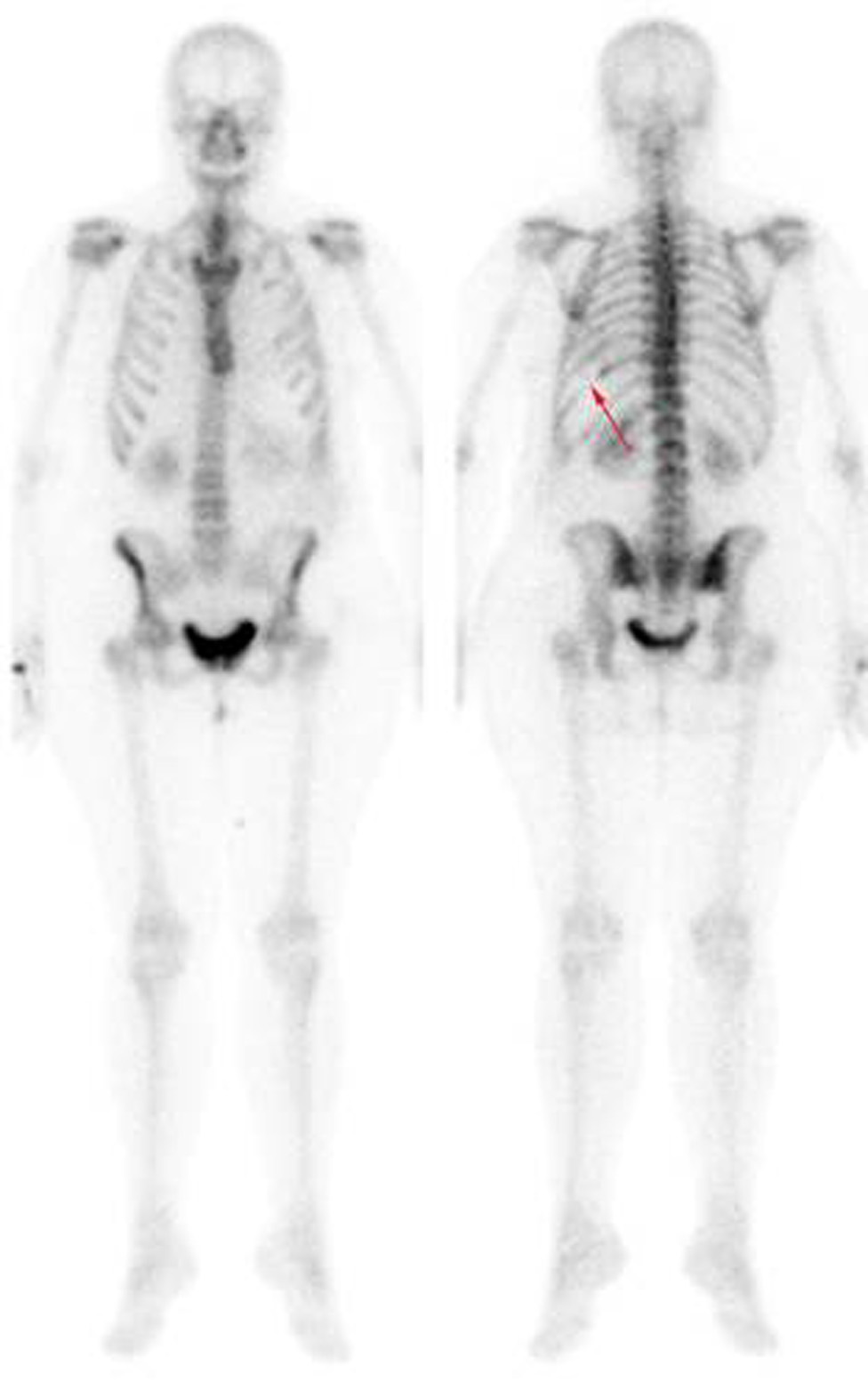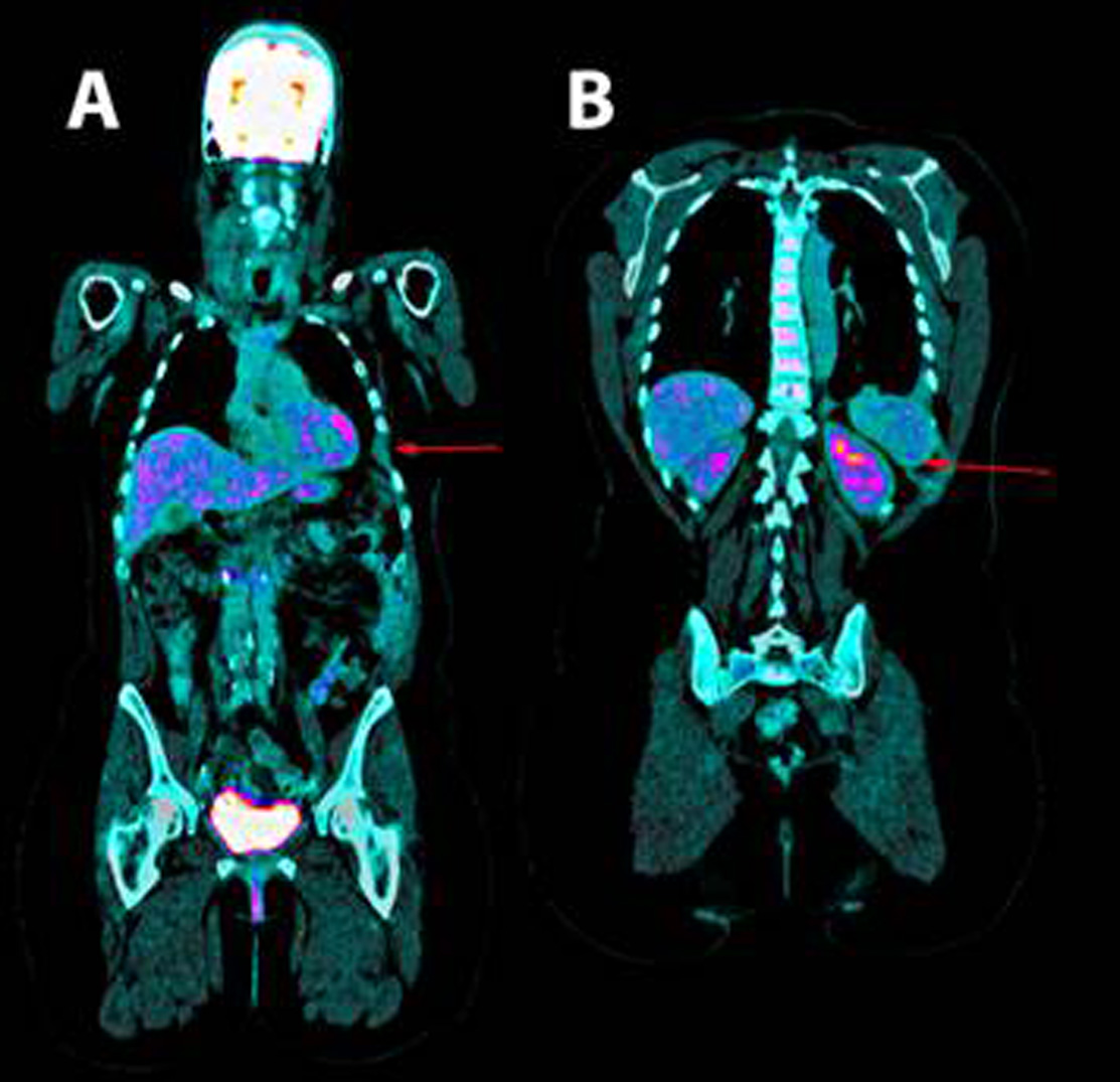 Figure 3. Positron emission tomography. A. shown the absence of the 6th and B. 10th left ribs arches.