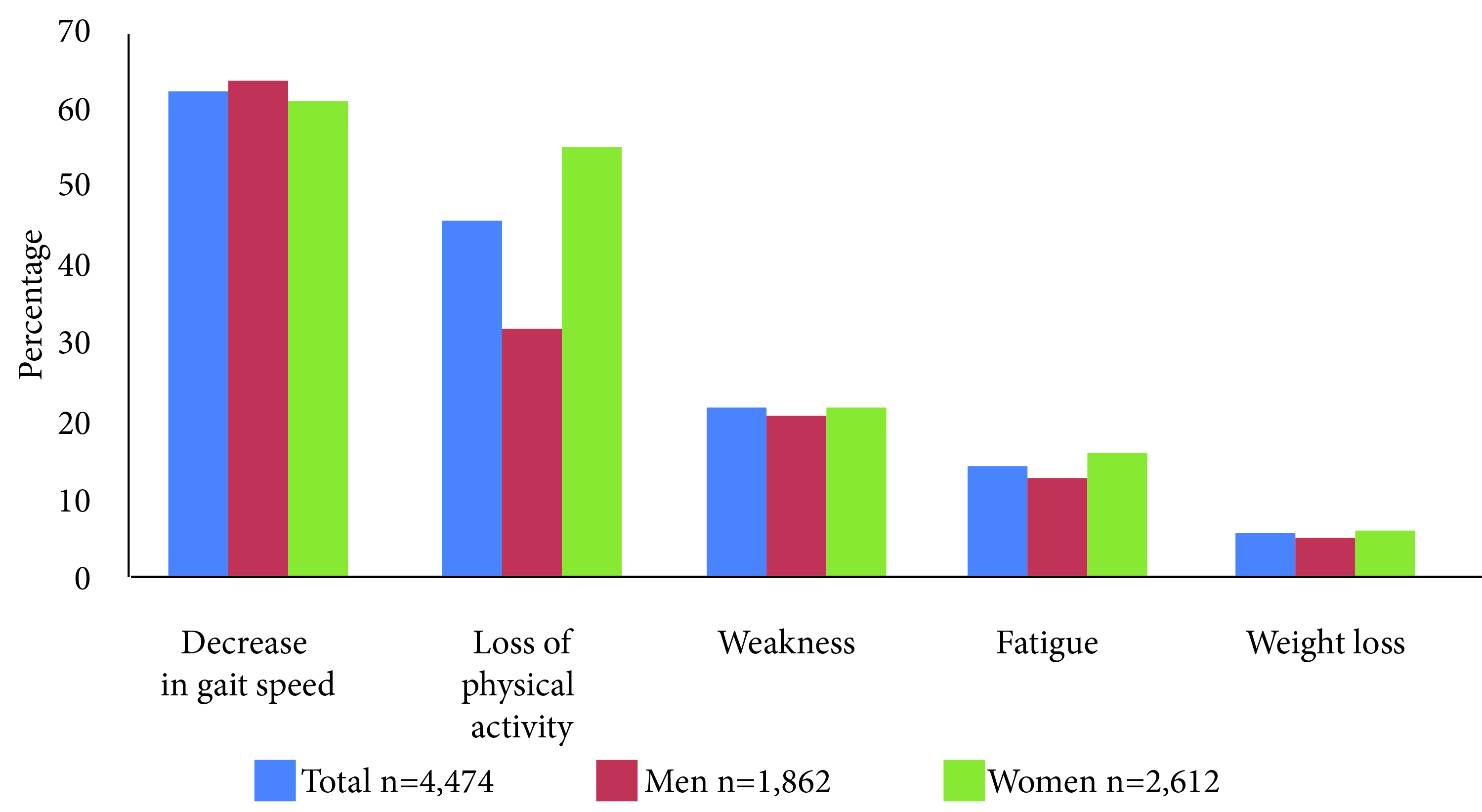 Figure 1 shows the prevalence of frailty phenotype components. The highest percentage is observed for the decrease in gait, and the lowest for weight loss. Women had greater loss of physical activity (p <0.001) and fatigue (p= 0.008) than men. Figure 2 shows the prevalence of the number of components (from 0 to 5) of the frailty phenotype. Women had a greater number of components (2, 3 and 4) than men (p <0.001).