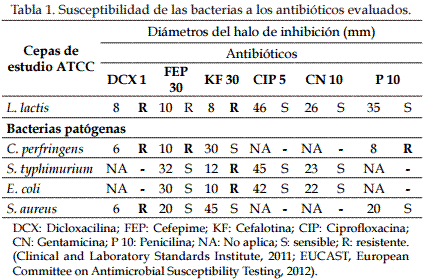 Los resultados de la prueba de susceptibilidad a los antibióticos se observan en la Tabla 1 y en la Figura 1. La cepa láctica presentó resistencia a la Dicloxacilina y Cefalotina; C. perfringens, a Dicloxacilina y Penicilina; S. typhimurium y E. coli, a Cefalotina; y S. aureus, a Dicloxacilina.