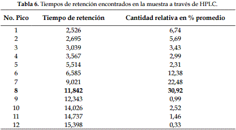 El análisis del sobrenadante de L. lactis por HPLC mostró una cadena de péptidos VAL-TIR-VAL en el tiempo 11,842 con una concentración de 0,66 mg/ml de muestra (figuras 4 y 5; tablas 5 y 6).