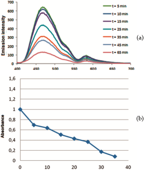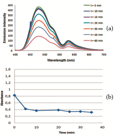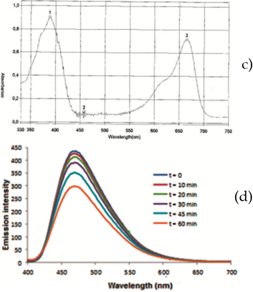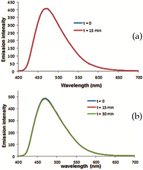 As illustrated in Figure 1(a), in the absence of a photosensitizer, the emission spectrum of PEA 1 exhibited a 400-650 nm band with a lmax at 470 nm that was not changed upon illumination during 15 minutes. Also, a comparison of the pre- and post-illumination emission spectra of PEA 1 in the presence of MB, but in an oxygenpoor environment, Figure 1(b), revealed that the characteristic 400-650 nm band was not changed after 15 min or 30 min periods of illumination. Likewise, the absorption spectrum of PEA 1, characterized by a 330-440 nm band with a lmax at 390 nm, was unchanged even in the presence of both MB and oxygen when the solution was not illuminated, Figure 1(c). These experiments indicate that PEA 1 was not bleached when a photosensitizer was not present whether oxygen was present or depleted. In clear contrast, as evidenced in Figure 1(d), emission spectra of PEA 1 in the presence of MB and oxygen monitored at 10, 20, 30, 40, 45 and 60 minutes of light exposure indicates the decrease in the amount of compound. This result is consistent with an absorbance decrease in the characteristic 330-440 nm band of the absorption spectrum of PEA 1, Figure 1(e). These results suggest that in the presence of oxygen, PEA 1 is photooxidized with the action of MB as photosensitizer. Moreover, this is confirmed with a plot that illustrates the trend of the absorbance of PEA 1 at lmax = 390 nm as a function of illumination time in the presence of both oxygen and the photosensitizer, monitored at 5 min-intervals, revealing an almost linear behavior, Figure 1(f). It is important to note that while the absorbance of PEA 1 steadily decreased, the respective 550-700 nm band characteristic of MB was not changed, Figure 1(e). This indicates that the photosensitizer is not sensitive to light and singlet oxygen during the photooxidation of PEA 1.