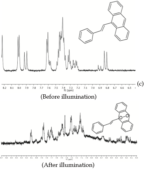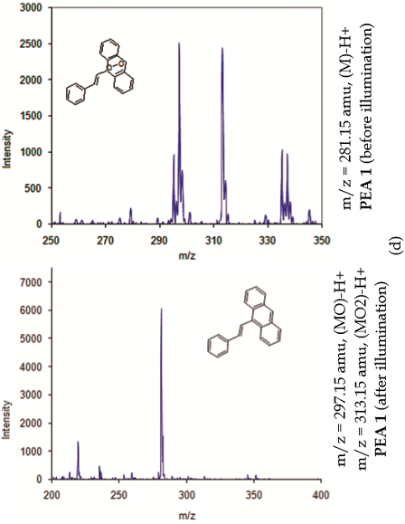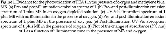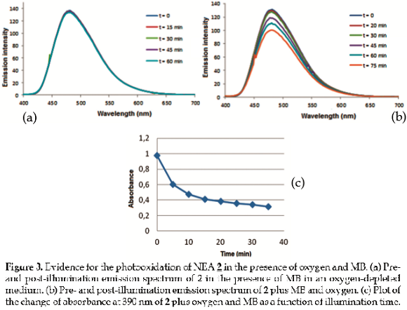 In conclusion, experiments on photosensitized oxidation were carried out using the synthetic probes PEA 1 or NEA 2. The results strongly suggest that these synthetic probes are able to trap singlet oxygen ¹O2 (¹▲g) in aqueous systems with significant specificity and sensitivity. These ¹O2 trap compounds react, presumably via a [4p+2p] cycloaddition pathway, giving rise to the respective endoperoxides. PEA 1 or NEA 2 solutions exhibit a characteristic intense absorptivity in the UV-Vis 330-440 nm region and, upon reaction under the proper conditions for a photosensitized oxidation, evident changes in the fluorescence intensity are observed in the 400-650 nm region. These probes were found to be photochemically stable under the experimental conditions utilized here. Additional proof that oxidation occurs in the presence of methylene blue or rose bengal photosensitizers were obtained by NMR spectroscopy and ESI-MS spectrometry analysis.