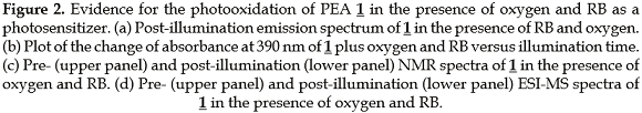 As illustrated in Figure 2, illumination of PEA 1in the presence of RB and oxygen clearly promoted changes in its emission and absorption spectra as well as its proton NMR and ESI-MS patterns. In fact, the intensity of the 400-650 nm band of the emission spectrum decreased as the sample was being illuminated, Figure 2(a). This result agrees with a continuous reduction of the absorbance at 390 nm during the illumination period monitored at 5 min intervals, Figure 2(b). The results strongly indicate that photooxidation of PEA 1 occurs by exposure to light in the presence of oxygen by action of either photosensitizer (MB or RB) tested. However, unlike MB, RB undergoes photobleaching, as evidenced by a decrease in its 500-600 nm band with time of light exposure, Figure 2(a).